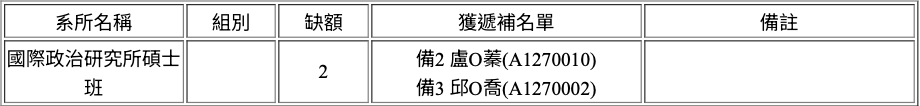 下列獲遞補名單內之新生,請於115年1月6日(含)12點前將「遞補入學確認書」(請至註冊組/新生專區網頁下載)傳真或郵寄至國際政治研究所辦公室,未寄送者視同放棄入學資格,並請統一於招生簡章規定之學歷證件驗證日期,至國際政治研究所辦公室辦理入學報到驗證,逾期未辦理者視同放棄。